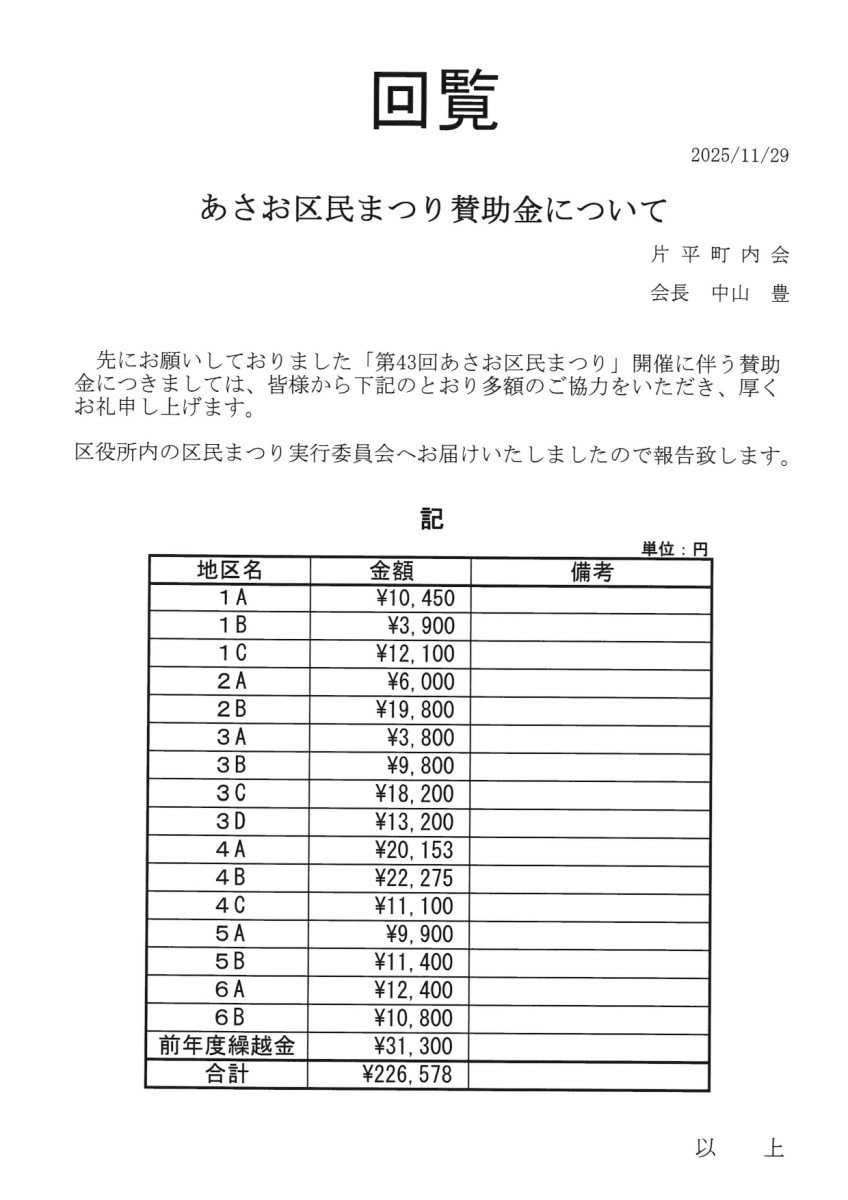 あさお区民まつり賛助金報告