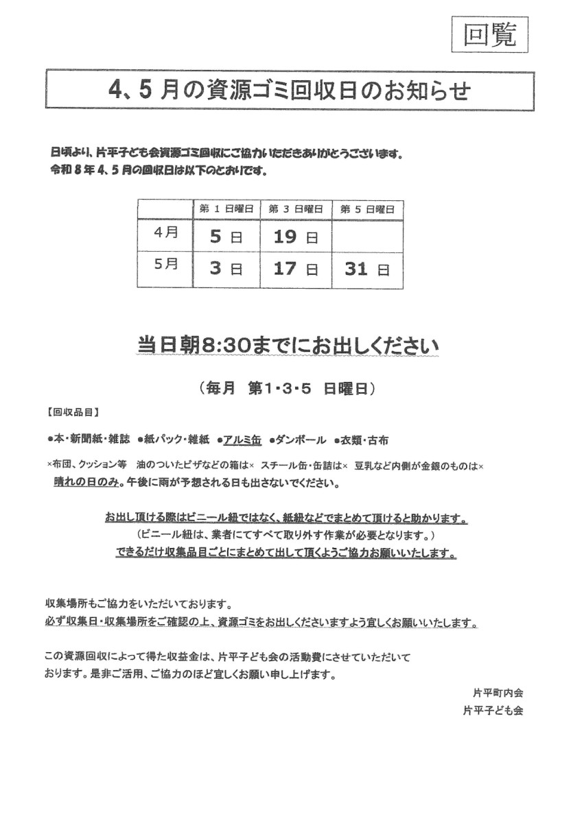 4,5月の資源ゴミ回収のお知らせ
